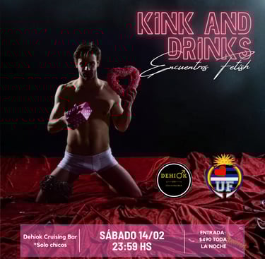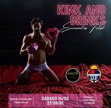 Kink and Drinks es una propuesta de encuentro social y sexual solamente para chicos, donde nos reuniremos fetichistas, morbosos, amantes del cuero, del latex, botas, uniformes, deportistas, amantes del BDSM, y todos los que gustamos de prácticas que escapan de lo "tradicional".